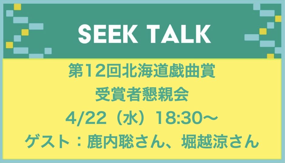 第12回北海道戯曲賞の大賞を受賞した鹿内聡さん(カレーカレーグループ)、優秀賞を受賞した堀越涼さん(あやめ十八番)をお招きして行うSEEK TALKです。日頃の活動についてや今回の戯曲のお話などをざっくばらんに伺い、札幌の劇作家をはじめとする演劇人たちと交流ができればと思っています。奮ってご参加ください。